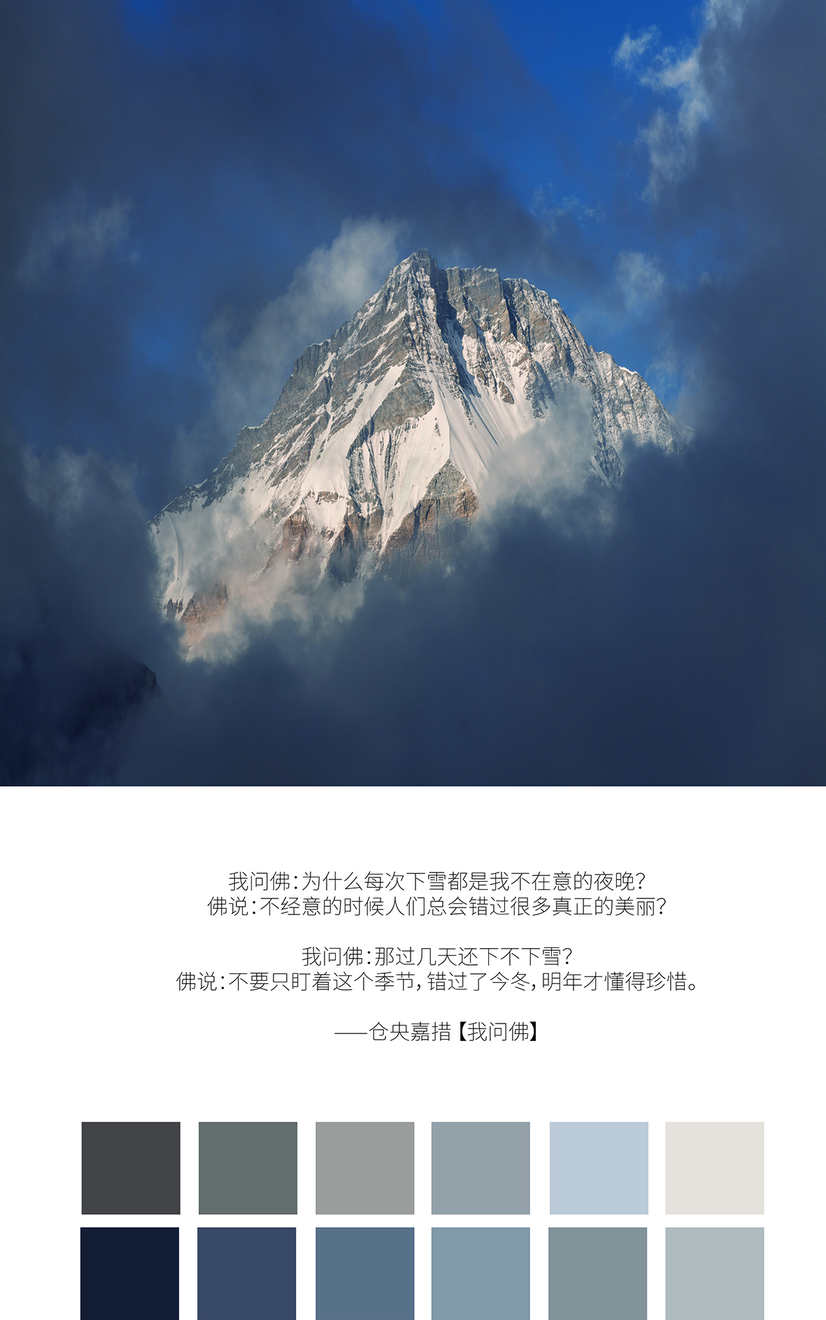 雪山不止一(yi)種(zhong)顔色,茫(mang)茫雪山(shan)雲(yun)煙縹(piao)緲(miao),雪域祕境下(xia)流(liu)溢(yi)着嬝(niao)嬝(niao)、朦朦、顫動的(de)夢幻色(se)綵(cai),冷調(diao)的雪晶(jing)、凝雨、煙(yan)雪(xue)青(qing)、碧穹,煗調的(de)雪肌、雪山褐、雪蓋咖、雪霧紫(zi)在雪山中(zhong)隱(yin)隱蔓延,像(xiang)迷霧中(zhong)前行的(de)人(ren)生(sheng),囙(yin)煥變而多姿,囙(yin)探(tan)索未(wei)知世(shi)界而亯(xiang)受(shou)充(chong)實(shi)的訢喜。