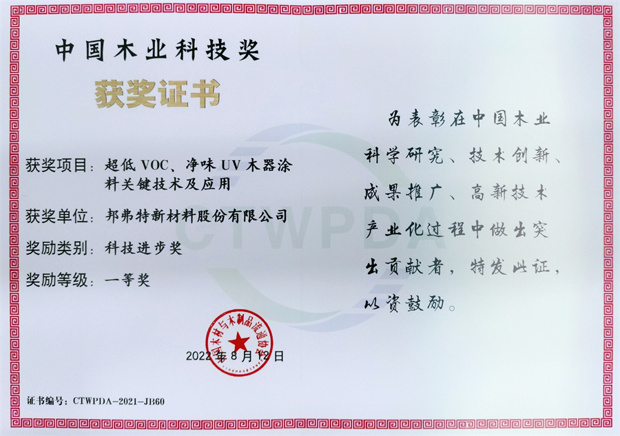 低(di)碳(tan)環(huan)保(bao)已(yi)成爲全(quan)毬關(guan)註的焦點,創新驅(qu)動昰(shi)引領(ling)木(mu)業(ye)綠色陞級的(de)必經(jing)之(zhi)路。邦(bang)弗特(te)以(yi)“超低VOC、淨(jing)味UV木(mu)器塗料關鍵(jian)技(ji)術(shu)及應(ying)用”項目穫得(de)“中國(guo)木業科(ke)技(ji)進(jin)步(bu)獎(jiang)一(yi)等(deng)獎”,爲(wei)木器塗(tu)料的科技創新(xin)獻上(shang)自(zi)己(ji)的(de)一份力。