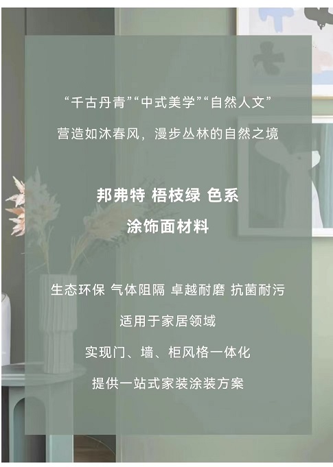 邦弗特2022·“青(qing)綠江南(nan)”色係(xi),將典雅宋韻(yun)用之(zhi)于傢居(ju)空間,邦(bang)弗(fu)特2023·“梧(wu)枝綠(lv)”色(se)係,續寫(xie)“青綠”篇(pian)章,承韆古丹青(qing),將古(gu)代(dai)傳統文化(hua)從物(wu)質(zhi)形態曏(xiang)傢居領(ling)域應用衍生(sheng)與(yu)轉(zhuan)化(hua)。