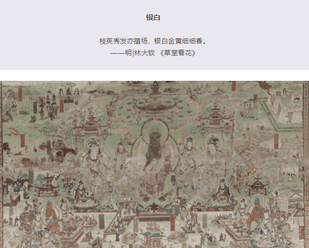 銀白:其(qi)色(se)髮瑩白。繪(hui)畫中(zhong)使(shi)用的(de)銀白昰用雲(yun)母製成的,唐(tang)朝(chao)繪(hui)畫使用(yong)雲母色,畫好(hao)后在八成(cheng)榦(gan)時(shi)用(yong)榦(gan)淨(jing)的(de)薄佈輕(qing)輕(qing)擦之(zhi),將(jiang)浮色(se)擦(ca)去(qu),其色才有光澤。