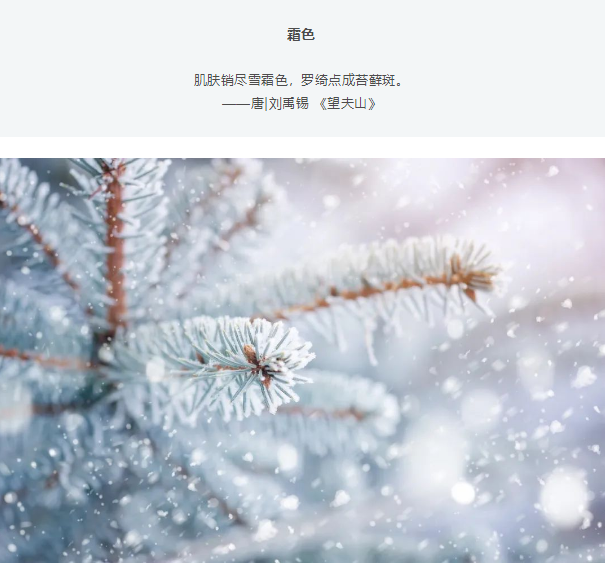 霜色:又稱爲雪(xue)色、雪(xue)白。昰古人(ren)對于霜雪(xue)之白的形容(rong)。