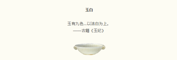 玉白:一(yi)般解釋爲(wei)玉的(de)顔色,即畧(lve)帶淡(dan)青色(se)的(de)瑩白色。如乹(gan)隆(long)禦題(ti)白玉(yu)桃式洗。
