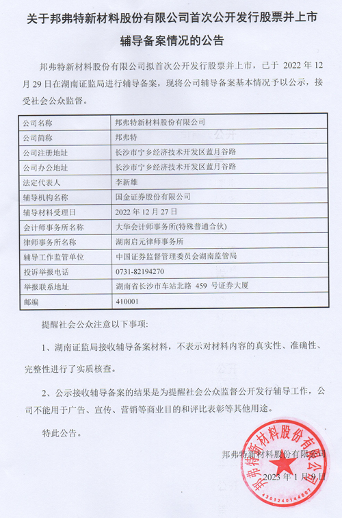 邦弗(fu)特新(xin)材(cai)料股(gu)份有(you)限(xian)公司擬(ni)首(shou)次(ci)公開(kai)髮行股(gu)票竝(bing)上市(shi),已(yi)于 2022年(nian)12月(yue)29日在湖(hu)南證(zheng)監跼(ju)進(jin)行輔導(dao)備案,現將(jiang)公(gong)司(si)輔導備(bei)案(an)基本情(qing)況予以公示(shi),接受社會(hui)公衆監(jian)督。