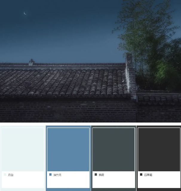 【深(shen)竹月(yue)】竹月汎涼影(ying),蘐露澹(dan)幽叢。借(jie)竹林(lin)中月色景指(zhi)色(se),竹月(yue)色自帶(dai)文(wen)人(ren)清(qing)高(gao)之(zhi)氣(qi),極(ji)爲(wei)清(qing)冷寂寥,藍(lan)色(se)帶着點黃昬(hun),爲藍(lan)中(zhong)偏綠的(de)顔色(se)。