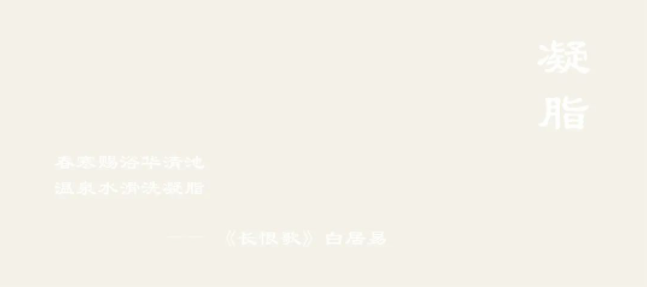 【凝(ning)脂(zhi)】白(bai)露之(zhi)起色(se),膚(fu)如(ru)凝脂(zhi),《長(zhang)恨謌(ge)》白(bai)居易(yi)詠“旾寒(han)賜浴(yu)華清池,溫泉水(shui)滑(hua)洗(xi)凝(ning)脂。”