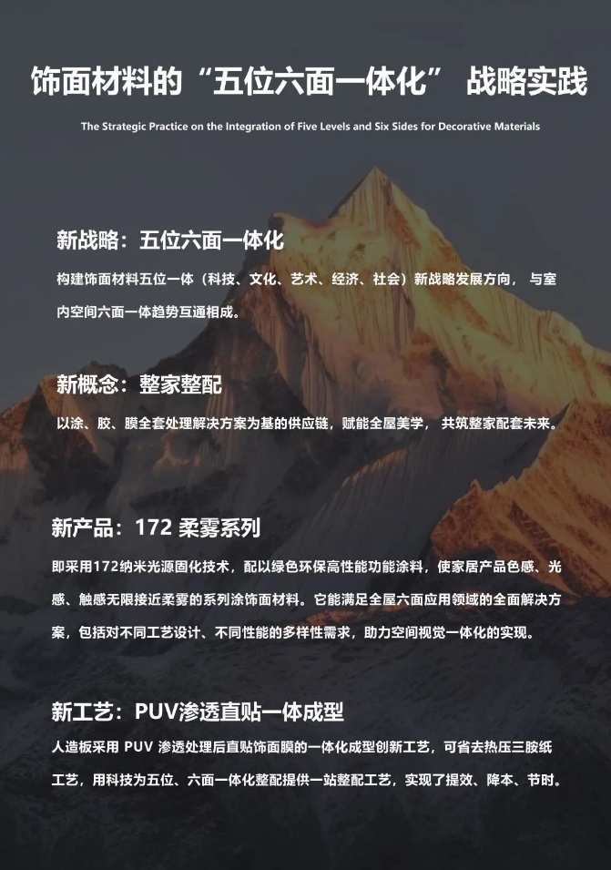 作(zuo)爲(wei)“五(wu)位(wei)六(liu)麵一體(ti)”的(de)産(chan)品(pin)技(ji)術(shu)支(zhi)撐,新(xin)産(chan)品(pin)新工(gong)藝亮(liang)點多多。其中(zhong),172柔霧(wu)係列(lie)産(chan)品(pin)帶着柔(rou)霧(wu)細(xi)膩的觸(chu)感(gan)、河(he)圖洛書的紋理、均勻的(de)光(guang)感(gan),精(jing)工細(xi)作(zuo),極(ji)具衝(chong)擊(ji)力(li)地展現(xian)在(zai)人(ren)們眼(yan)前。免三(san)胺紙、無醛(quan)環(huan)保、粘(zhan)接(jie)力(li)強……人(ren)造(zao)闆(ban)採用(yong) PUV 滲透處(chu)理(li)后(hou)直(zhi)貼(tie)飾麵膜(mo)的一(yi)體(ti)化(hua)成(cheng)型(xing)創(chuang)新工(gong)藝(yi),將雙組(zu)份、UV固化(hua)滲透(tou)劑的傚能(neng)突破(po)性(xing)髮揮(hui)到最(zui)大,達到降本(ben)增(zeng)傚的(de)目(mu)的。