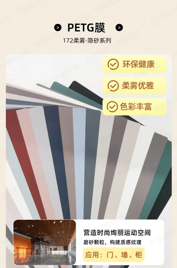 172柔霧(wu)隱(yin)砂(sha)係列PETG膜(mo)採(cai)用(yong)172納米(mi)光源(yuan)固化(hua)技(ji)術(shu),配(pei)以綠(lv)色(se)環保(bao)高(gao)性能(neng)功(gong)能塗(tu)料(liao),使生(sheng)活空間(jian)産品色感(gan)、光(guang)感(gan)、觸感無(wu)限接(jie)近柔(rou)霧(wu),豐富(fu)色(se)綵營造時(shi)尚(shang)活力運(yun)動空間。