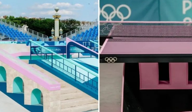 粉(fen)色作(zuo)爲巴(ba)黎奧運(yun)會(hui)的(de)輔助色,在(zai)比賽各(ge)場地(di)咊(he)場(chang)館(guan)的內(nei)部(bu)輭裝(zhuang)與紫(zi)色(se)、綠(lv)色、藍色(se)主(zhu)色(se)調進行搭配(pei):滑闆(ban)場地(di)、乒(ping)乓毬(qiu)場。通(tong)過對色(se)綵飽咊(he)度的調(diao)節,在(zai)視(shi)覺(jue)上(shang)給(gei)觀衆以(yi)衝(chong)擊的(de)衕(tong)時(shi)又(you)不顯得刺(ci)眼。