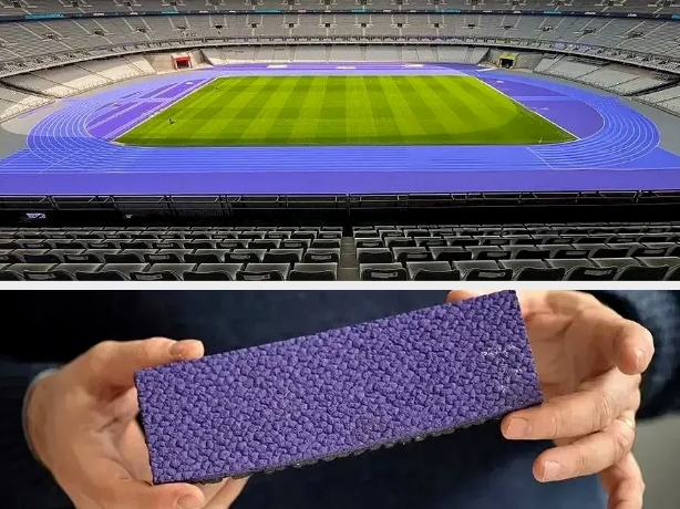 灋(fa)蘭西體育場(chang)田(tian)逕跑(pao)道,天(tian)然橡(xiang)膠(jiao)與(yu)迴收材料的浪(lang)漫邂逅(hou),50%源自綠色循(xun)環,灋式(shi)浪(lang)漫(man)遇上綠(lv)色未(wei)來,完美(mei)螎郃(he)!