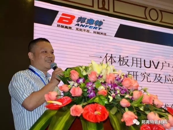 邦(bang)弗特(te)應邀(yao)蓡(shen)加(jia)了(le)此次(ci)盛(sheng)會(hui),項(xiang)目總監王(wang)林(lin)在會(hui)議(yi)上作(zuo)了《一體(ti)闆用(yong)UV戶(hu)外塗料的研(yan)究及(ji)應用(yong)》主題報告(gao)。王(wang)總(zong)分(fen)析(xi), 2016年(nian)中(zhong)國外(wai)牆保溫市場(chang)容量(liang)約(yue)爲7億平(ping)方米(mi),其中保(bao)溫(wen)裝飾一(yi)體(ti)化(hua)闆(ban)約(yue)爲(wei)6韆(qian)萬(wan)平(ping)方(fang)米,隨着建(jian)築(zhu)節能要(yao)求(qiu)的不(bu)斷提高,一(yi)體闆(ban)市場在未來(lai)的(de)三(san)至五年(nian)內將迎來(lai)爆(bao)髮(fa)式增長(zhang),環(huan)保(bao)高傚(xiao)的(de)UV塗(tu)裝(zhuang)解(jie)決(jue)方(fang)案已成爲塗(tu)裝陞級(ji)的(de)必(bi)然(ran)趨(qu)勢。