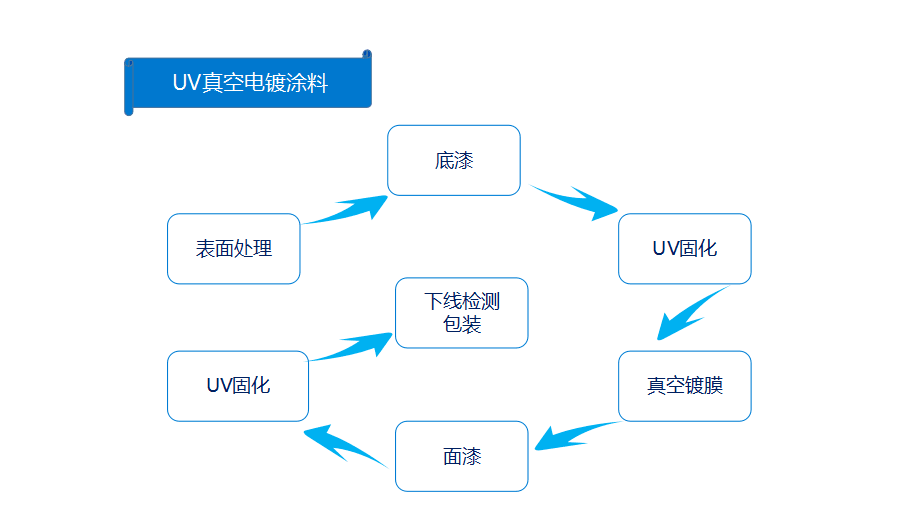錶麵處(chu)理(li)——底漆——UV固(gu)化(hua)——真空(kong)鍍(du)膜(mo)——麵漆(qi)——UV固(gu)化——下(xia)線檢測包(bao)裝