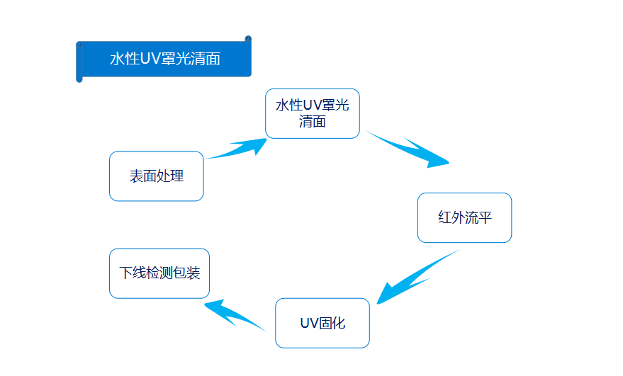 錶麵(mian)處(chu)理(li)——水性UV罩光清(qing)麵——紅(hong)外流平(ping)——UV固化(hua)——下(xia)線(xian)檢測包(bao)裝